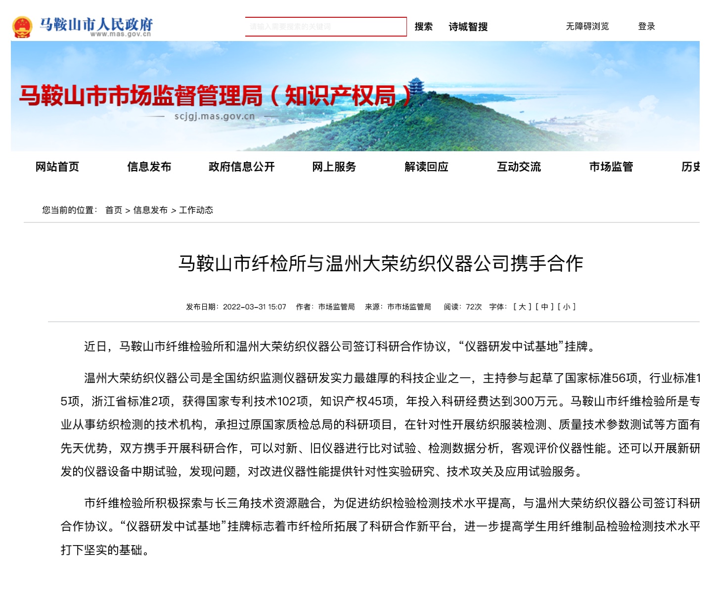 溫州市大榮紡織儀器公司是全國紡織監(jiān)測儀器研發(fā)實力較為雄厚的科技企業(yè)之一,主持參與起草了國家標(biāo)準(zhǔn)56項,行業(yè)標(biāo)準(zhǔn)15項,浙江省標(biāo)準(zhǔn)2項,獲得國家專利技術(shù)102項,知識產(chǎn)權(quán)45項,年投入科研經(jīng)費達到300萬元。馬鞍山市纖維檢驗所是專業(yè)從事紡織檢測的技術(shù)機構(gòu),承擔(dān)過原國家質(zhì)檢總局的科研項目,在針對性開展紡織服裝檢測、質(zhì)量技術(shù)參數(shù)測試等方面有先天優(yōu)勢,雙方攜手開展科研合作,可以對新、舊儀器進行比對試驗、檢測數(shù)據(jù)分析,客觀評價儀器性能。還可以開展新研發(fā)的儀器設(shè)備中期試驗,發(fā)現(xiàn)問題,對改進儀器性能提供針對性實驗研究、技術(shù)攻關(guān)及應(yīng)用試驗服務(wù)。